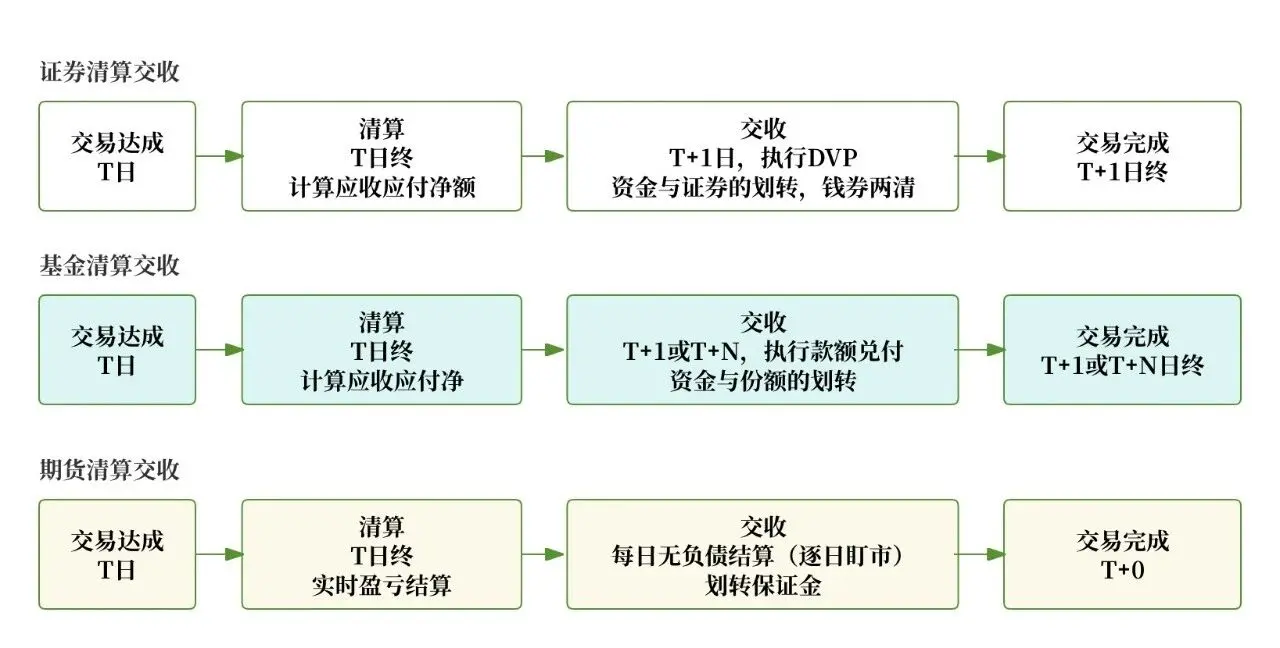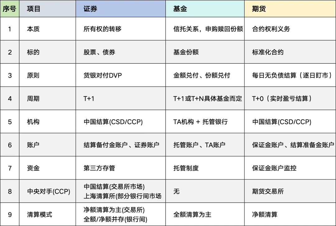 所有场景都围绕 “交易-清算-交收” 这根主线;CCP(中央对手方) 在证券和期货交易中都是不可或缺的风险防火墙;DVP(货银对付) 是证券交收的黄金法则;每日无负债结算 是期货市场的风险控制核心;第三方存管(证券)、托管制度(基金)、保证金监控中心(期货)都是为了实现客户资金与机构自有资金的隔离,保障投资者资产安全。