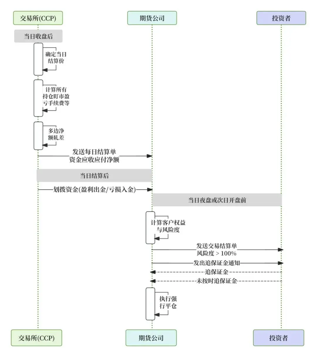 流程:收盘后交易所确定当日结算价 -> 交易所计算所有会员所有合约的盈亏、手续费、税金等 -> 净额轧差,计算出其当日应收应付的资金净额 -> 期货公司根据结算结果,计算每个客户的权益。如下图所示: