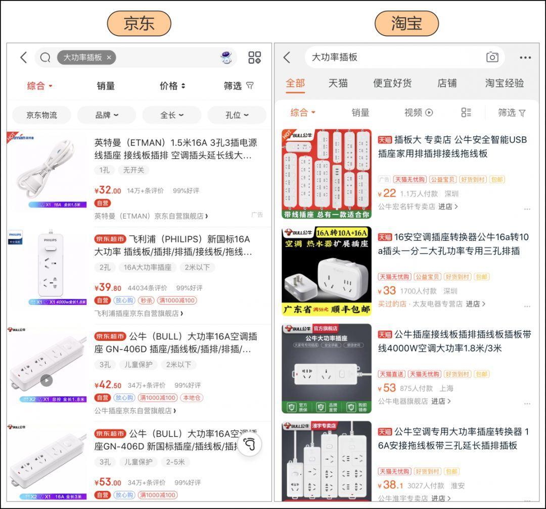 通过对比图我们能够发现,即使是“大功率插板”这般冷门的商品,京东对参数的选项都做了很多的优化和完善,很多筛选条件都是为理性系统特意挑选的。特别是在筛选页面中,几乎有大功率插板所有的参数选择,这正是理性系统需要的。