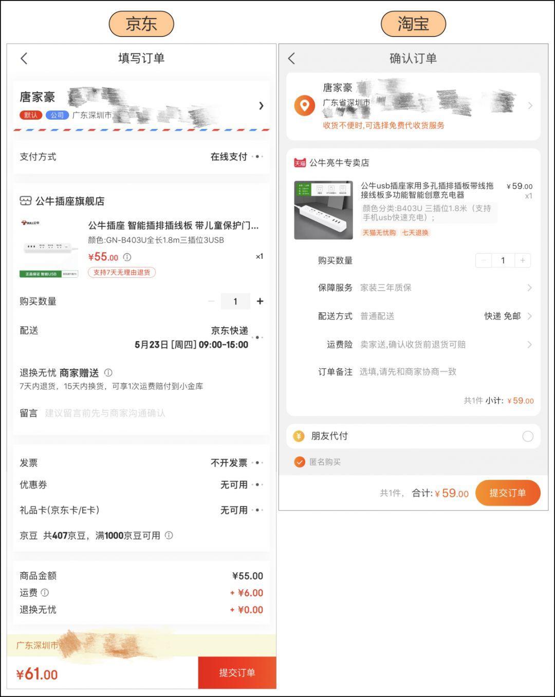 从订单页面的对比图我们能够看出,京东的订单页面明显更长,信息更多,原因还是我们刚刚说到的,京东是为了满足理性系统的需求,所以把所有信息都摊在用户面前,让用户自行选择和判断。