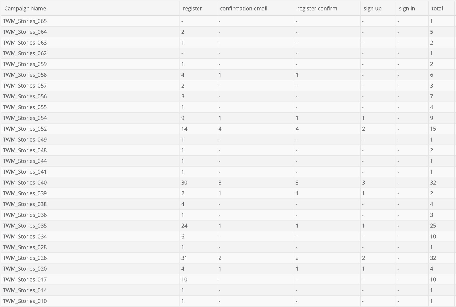 这是我们追踪系统后台的数据呈现,分为点击到注册页面(total)、注册(register)、确认信件点开(confirmation email)、确认注册(register confirm)