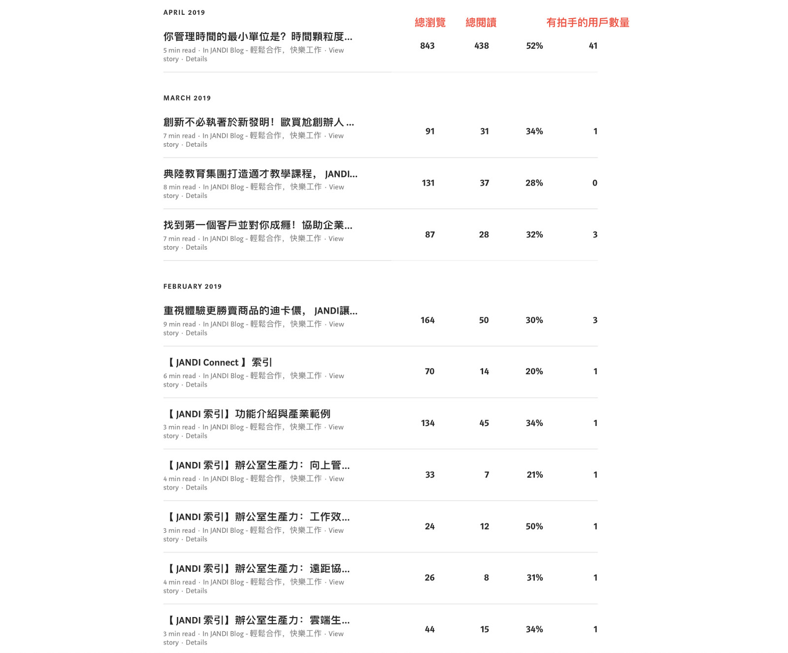 我将三个内容种类“产品介绍”、“用户故事”、“生产力”由上往下撷取一部分出来(类别的文章总数在标签旁的 “Count”,没想到我们这两年来,已经快要 200 篇拉,大家好拼啊啊啊)。