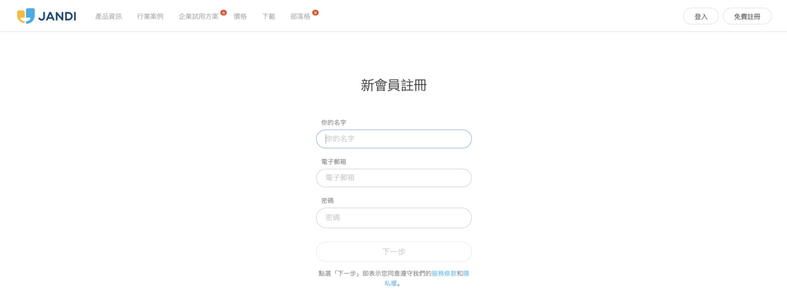JANDI 的【会员注册】页面,填写完毕后会收到一封确认邮件
