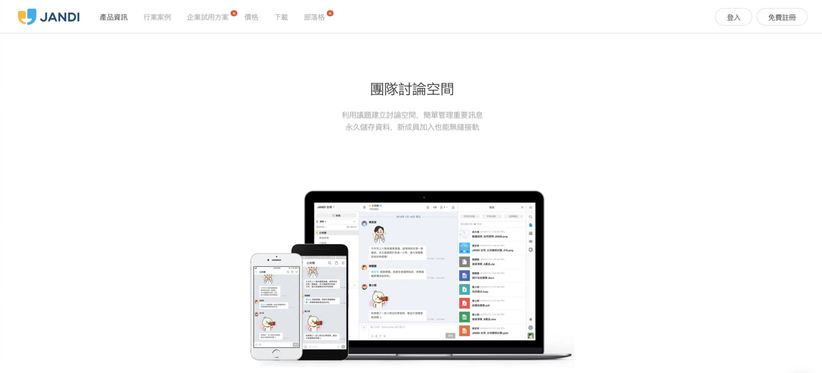 JANDI 的【产品资讯】页面是一页式网页,介绍产品和服务特点