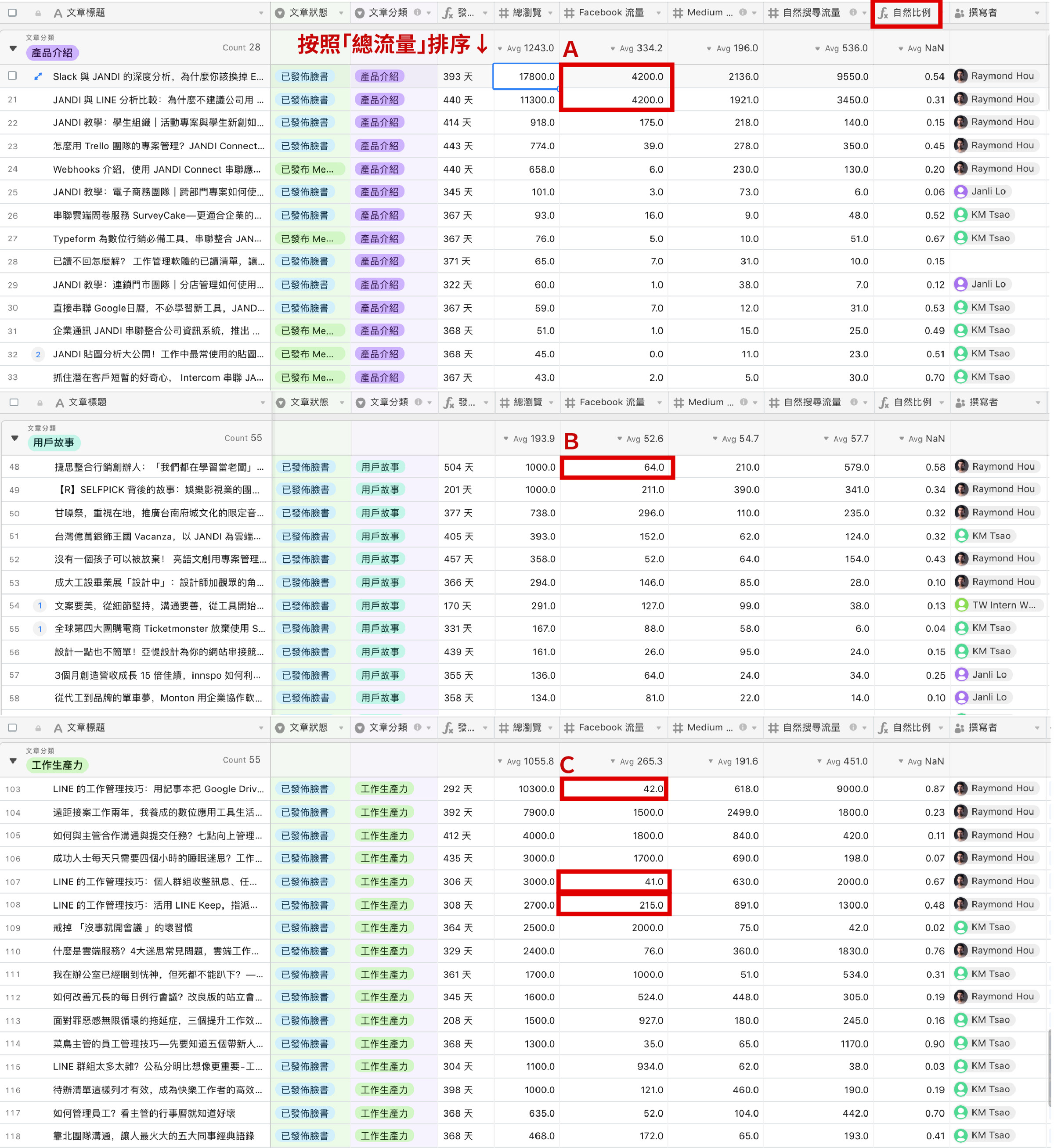 然而,如果我们每周更新一次文章流量的数据(我建议是每周一次,最少两周一次…如果人力真的吃紧的话,后面谈到 Airtable 会讲),我们会发现——“第三篇”这种吃“脸书流量”(会冲到 2K 是因为这篇有下广告)的内容, 如果在广告结束后,自然流量还没有起来的话,90% 这篇文章的流量就卡在这边,死了。
