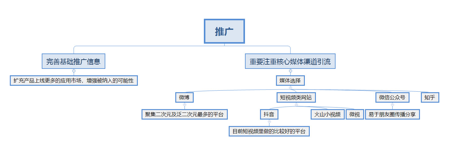 - 推广层面: 重点维护好各大应用市场(扩大上线平台及做好对应的ASO优化),以便吸引更多有兴趣尝试的种子用户;