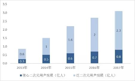 根据艾瑞发布的数据,截至2017年,我国二次元用户整体规模达3.1亿,核心二次元用户0.8亿人,泛二次元用户2.3亿人,人群规模不断增长,泛二次元用户规模越来越大,也拉动了由二次元文化衍生出的周边产业。