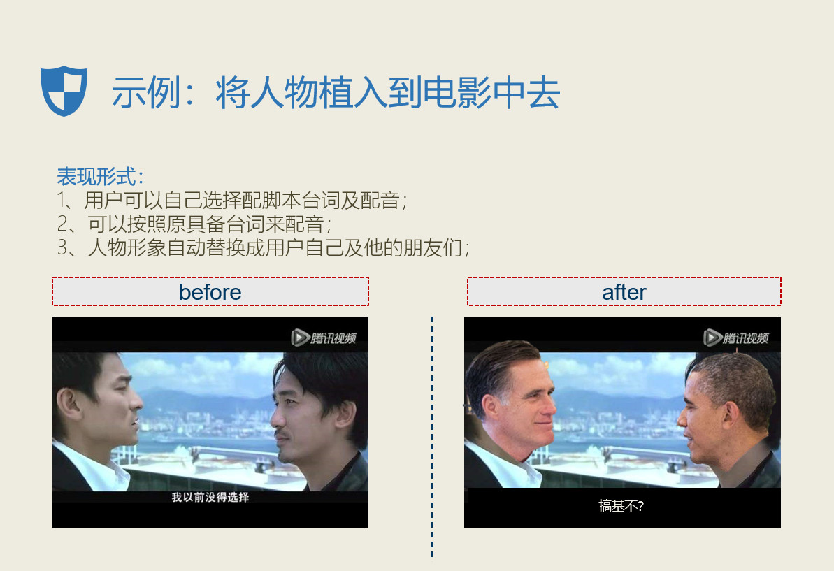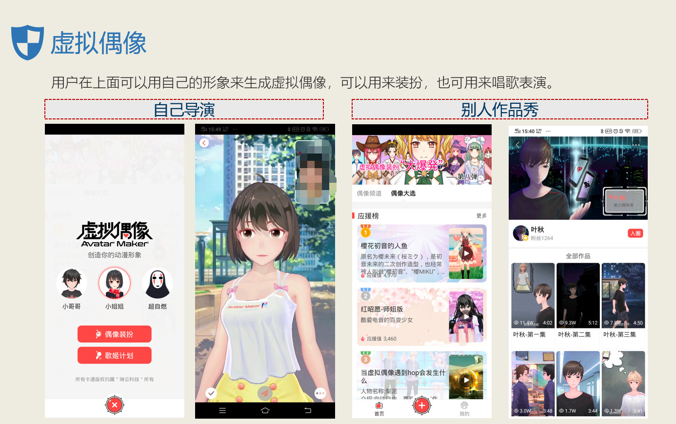 - 视频场景化 ——可以将拍照的真人虚拟化成相似的动画人物形象;
