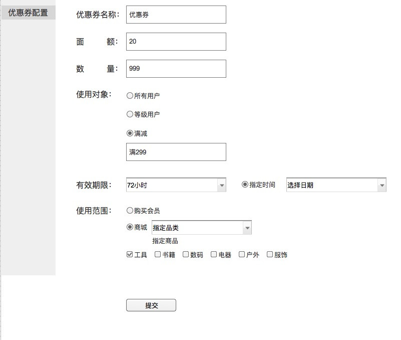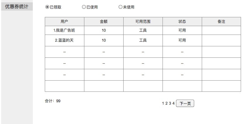 券不会凭空产生,也需要工作人员来操作发放。作为设计者,我们要根据业务需求来设置优惠券的各种属性。比如这个券用于什么时间,是五一活动,还是店庆活动。能使用在什么产品上。这就需要建立后台配置,运营者可根据需求灵活来设置优惠券的各种属性,只要有活动就可以配置出满足不同需求的优惠券。