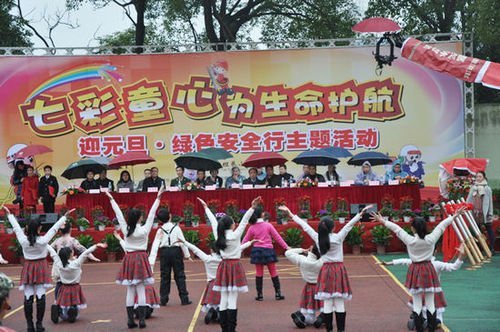 淋雨表演的小学生和打着伞的学校领导