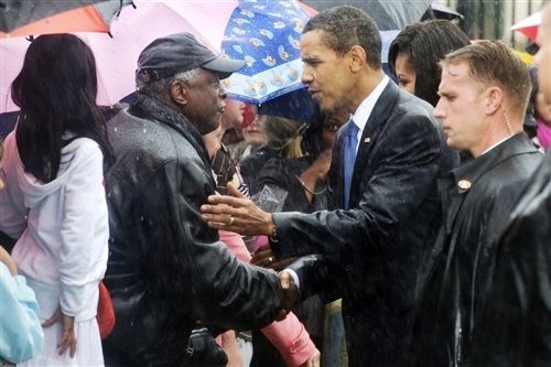 奥巴马淋雨和支持者交谈