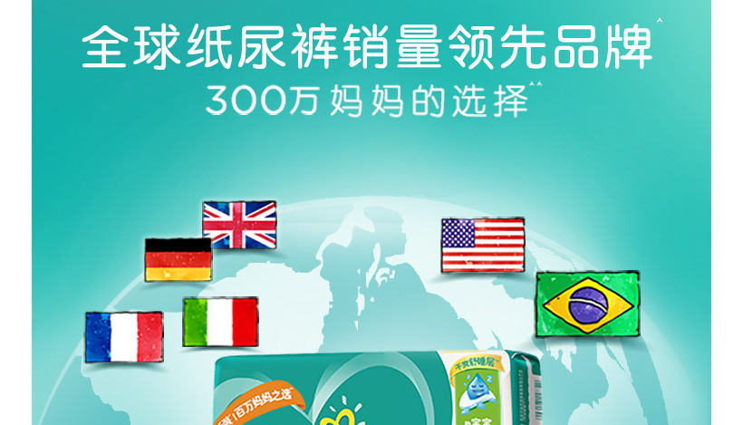 整张图同样是实力的体现,全球领先品牌和300万妈妈都是实力的体现,使用各个国家的真实国旗样式又进步加强的信任感。