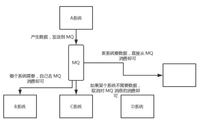 通过消息队列可以让数据在多个系统更加之间进行流通。数据的产生方不需要关心谁来使用数据,只需要将数据发送到消息队列,数据使用方直接在消息队列中直接获取数据即可