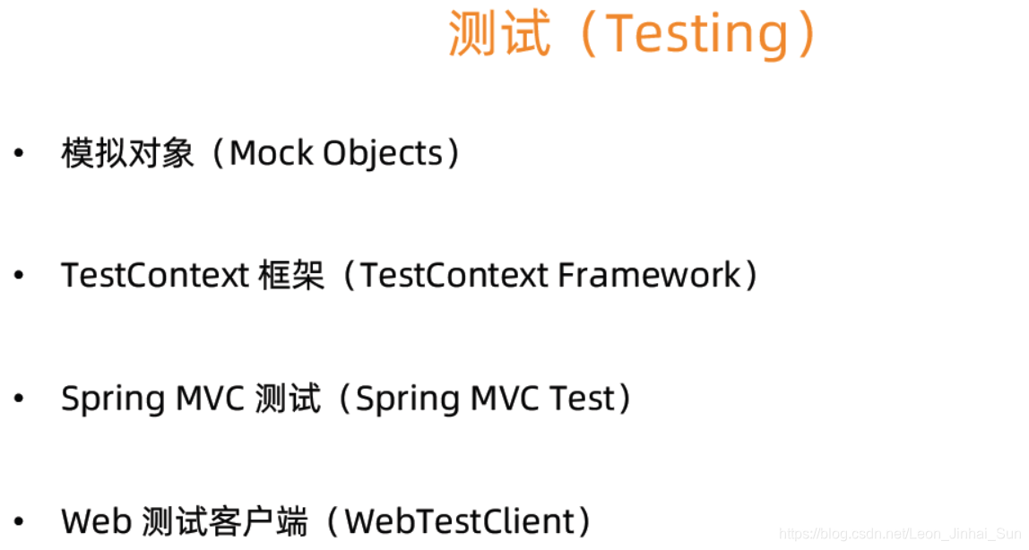 Spring Framework里面生成的MockHttp接口,这个接口能够帮助我们去实现一些方法的调用,帮助我们完成单元测试 - 除了单元测试,还有集成测试,包括TestContext框架,这个框架其实是Spring对它的集成测试过程的一个整合,比如说对数据库远程方法调用,这时候需要把整个Spring应用上下文给启动,这时候也必须借助于TestContext框架来进行整合