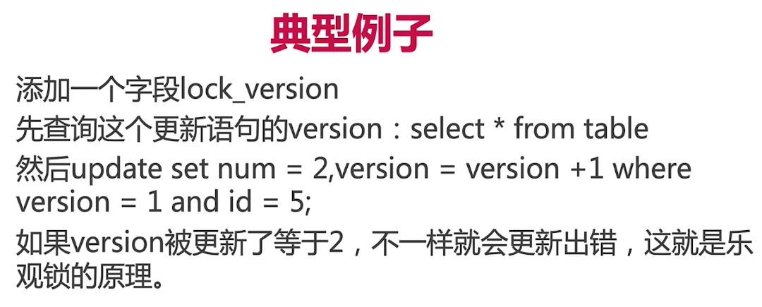 - 乐观锁:适合并发写入少,大部分是读取的场景,不加锁能让读取性能大幅提高