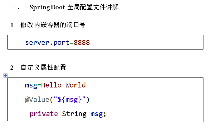 我们已经去构建了SpringBoot项目,在这个项目当中,与全局配置文件的一个讲解,虽然在之前,讲解了SpringBoot的全局配置文件,那么咱们还有一些内容呢,没有讲到,我们再做一个补充,我们看全局配置文件中的第一个内容,修改端口号,修改内嵌容器的端口号,回到我们的项目当中,其实我们知道,在我们的SpringBoot当中,对于内嵌的Tomcat,默认的监听端口号是8080,在这里我们可以把我们的项目启动一下,看一下控制台输出的监听的端口号端口,端口号是多少,我们项目启动完毕以后呢,他默认的监听的端口号是8080,比如我现在想把端口号改成8888,该怎么去做呢,回到我们的全局配置文件当中,在这里我们只需要添加一个键值对就可以了server.port=8888那这个我们要注意的就是,key必须要交server.port,因为springboot在解析的时候,他要去解析这个配置文件,在全局配置文件当中,他发现有server.port了,他知道你要修改服务的端口号,所以这是不能随便取的一个key,就叫server.port,下面我们再启动一下我们的项目,我们看一下控制台输出,现在是不是变成了8888了Tomcat started on port(s): 8888 (http)那么也就是说我们修改端口也是成功的,这个也就是SpringBoot当中,修改端口号的一个方式,接下来我们再看一下,我们可以在SpringBoot的全局配置文件当中,除了修改端口号以外,还可以做什么呢,比如完成自定义属性的=配置,那么其实自定义属性配置,已经讲过了,这个叫法大家听着挺陌生的,这个名这么叫也没有问题,什么意思呢,比如我现在要在配置文件里,key跟value,这个value呢,他将作为一个配置项,未来会注入到我的代码当中,如果我想有这样的一个设计的话,有这样的一个需求的话,我该怎么去实现呢,很简单,比如我这里有一个msg,然后后面给一个value,就叫Hello World,现在我就要把msg所对应的value通过一定的方式,注入到我的代码当中,我们来看一下这怎么做,首先我添加一个key和value,然后我们去创建一个Controller,然后这个名字叫HelloWorldController,然后在这个Controller当中,我们先去用一个@RestController,这个注解大家应该知道是什么意思了,也就是以JSON格式来返回了,然后再加一个@RequestMapping,将一个URL绑定到一个方法上,我就叫hello,然后定义一个方法返回String,叫showMsg,然后这个方法写完了,在我的这个Controller当中呢,我有一个成员变量,String类型的,就叫msg,在这里我return这个msg,将他的信息返回,然后我要把key的valule注入到这里,用一个@Value的注解,然后写一个类似EL表达式的语法,把我们的key填进来,这样就可以了@RestController