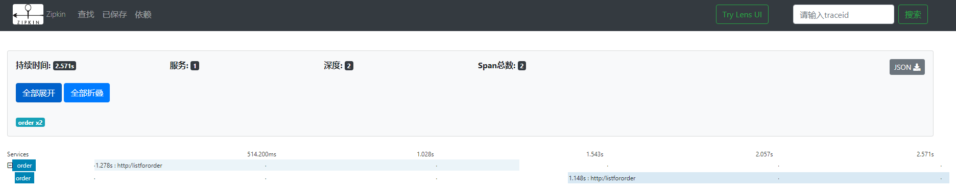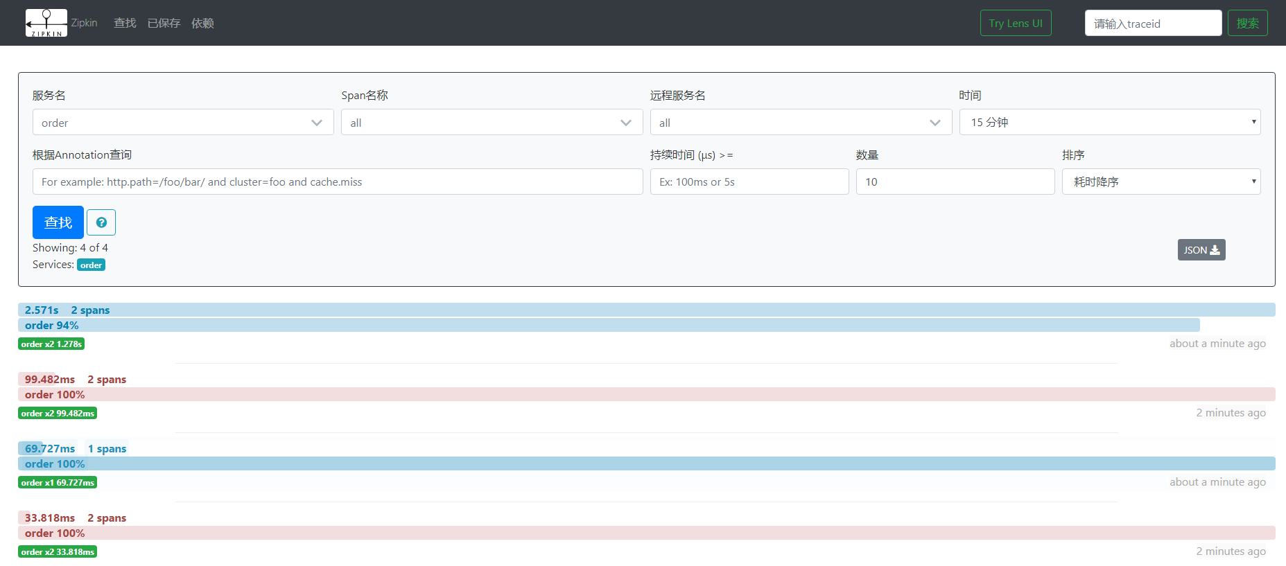 }默认的是0.1,0.1就是10%,这个什么意思呢,其实它并不是我们想象中的,把所有的请求都发出去,默认的只将10%的请求,发送到外部的服务,比如zipkin,那么他为什么不全部发出去呢,大家要想一下,如果全部发出去的话,对服务的性能啊,还有带宽,都是有要求的,我们要监控的请求,他就是10%,那么你万个请求里面,挑1千个,其实也能够发现问题的,这就是一个抽样,抽样观察,那么开发环境我们可以设置为1,1就是百分之百,所有的数据都发送出去,spring.sleuth.sampler.percentage=1已经重启成功了,再来下个单,现在再来看一下链路追踪,现在已经有了,有了order这个服务http://59.110.158.145:9411/zipkin/http://localhost:8010/listForOrder我们点查找,就可以看到请求了