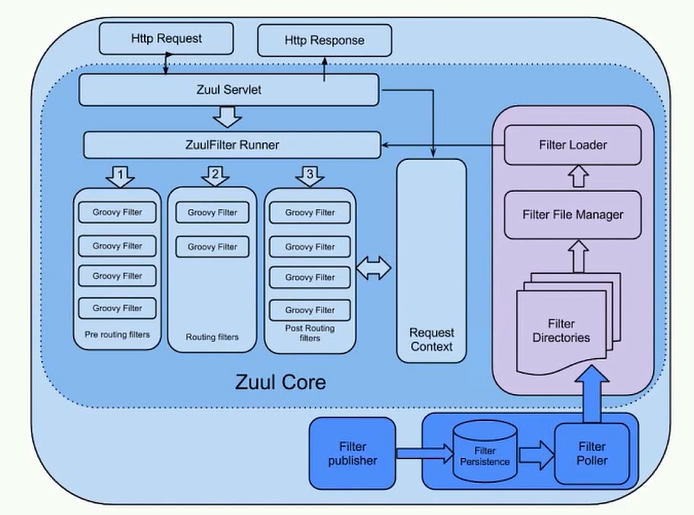 这幅图就是Zuul整个组建的架构图,可以看到,他们过滤器之间,是没有直接通信的,他们之间有一个Request Context,就是上下文,通过这来进行数据传递