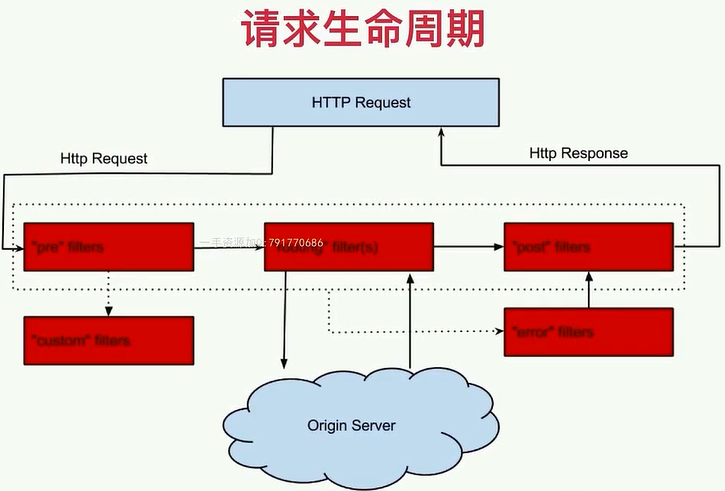我们在看在Zuul组件里面,一次HTTP请求,生命周期是什么样子的,上面就是一个请求进来,这些红的就是他的过滤器,最下面这个Orgin Server,就是我们后面的服务,比如上面提到的Product服务,可以看到进过一系列的过滤器之后,才返回这个请求,那么这些过滤器,我们依次的来看一下,他首先是到Pre过滤器,他不是一个过滤器,在这个类型下面又写了很多个过滤器类,所以看似一次简单的请求返回,其实这里实现 还是很复杂很多的,首先到达的是Pre Filter,过滤器,从名字也可以看出来,这里做的事情主要是对路由前置的一些加工,比如我们要做的参数校验,你就放到这个地方来做,接下来是Routing Filter,Routing Filter做的事情,就是将WEB的请求,给他转发到Orgin Server上去,那你觉得他这个HTTP请求,他用的方式性能不够高,或者不够优雅,你想重写它的HTTP请求,那么你可以到这个地方来做,再往后呢,POST Filter,这个时候你已经拿到了返回的结果,假如你想对结果进行处理和加工,那么你可以在这个地方来做,下面有一个Error Filter,Error Filter是在上面提到的这三个,过滤器发生异常之后,他就会到达Error Filter,所以如果要做一些统一异常处理的话,你要在Error Filter这个类里来做,最左边左下方,左下方的Custom Filter,定制的过滤器,他的意思是说我们自己定义的可以放到这边来,事实上不仅可以放到Pre Filter这边,也可以放到Post这边,都是可以的