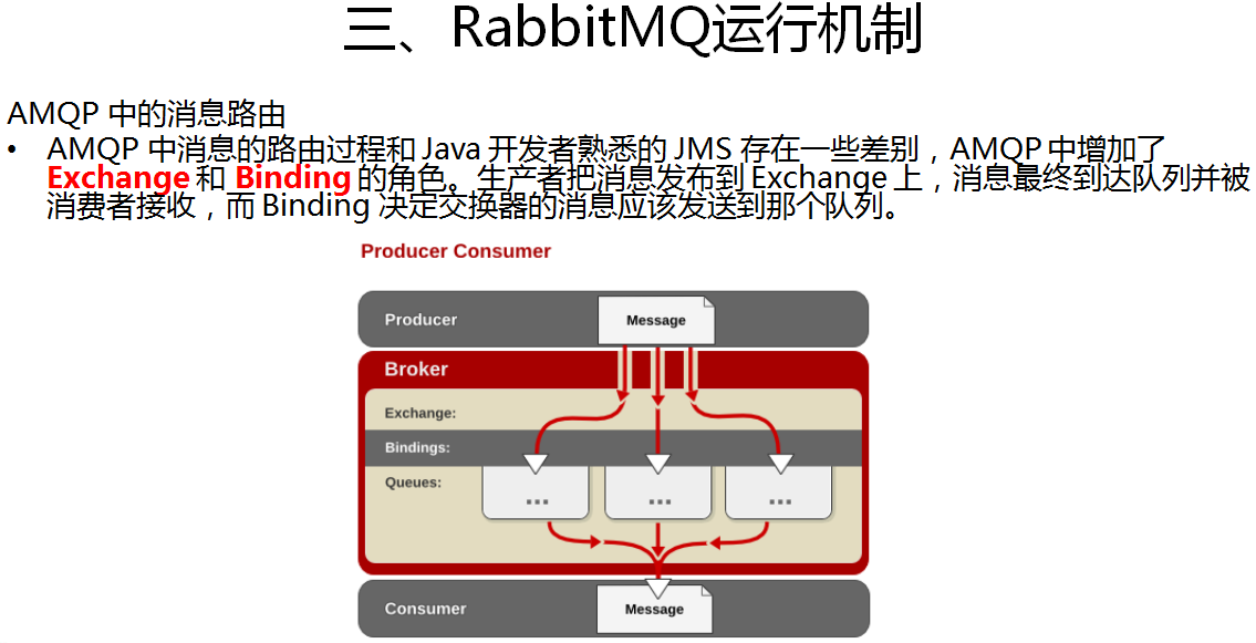 RabbitMQ的核心运行机制,首先在我们高级消息队列的路由机制,这个和JMS是有大差别的,他给我们增加了Exchange和Bindding,Exchange就是我们介绍的交换器,和Binding绑定的路由规则,那我们一个消息是如何从一个生产者到消费者呢,它是这样的,首先我们这个生产者,他给我们生产了一个消息,准备发布到哪个队列上,我们生产者先把消息发给Broker,也就是我们的消息代理,也就是我们的服务器,而这个服务器呢,收到消息以后,他把这个消息,给到一个合适的交换器,这个交换器呢,它是和我们这个消息队列来进行绑定的,我们服务器中有非常多的交换器,有非常多的消息队列,消息给交换器以后,交换器根据消息携带过来的路由件,来判断,我是要交给你这个队列,还是交给这个队列,还是交给这个队列,还是我一起都交给他们,交换器通过这个绑定规则,交给队列以后,我们接下来消费者,就可以连接上这些队列,来取出相应的消息了,核心就是这个交换器,和绑定规则,交换器不同,绑定规则不同,那我们派发消息的这个结果,就不一样