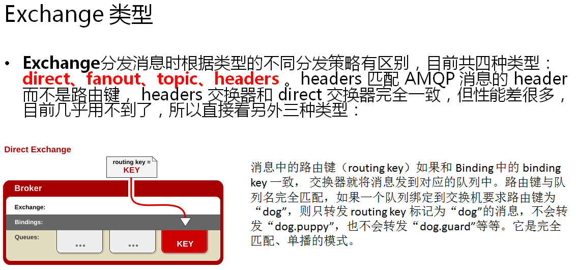 之前我们介绍交换器有四种类型,一种是direct,还有fanout,topic,还有headers,headers我们就不说了,后来用的呢非常少,他不是路由件来判断的,而是由高级消息队列的消息头,那我们就直接来说前三种,第一种我们叫direct,这个是直连型的交换器,他的作用呢,就是当我们发送消息时的这个路由件,和我们绑定件一模一样的时候,消息就会派发给这个队列,举一个例子,我们这里有一个交换器,他的类型呢,是direct,他下边绑定了几个消息队列,比如是接收路由为dog的消息,而这个绑定规则,是来接收路由key为dogpuppy这个消息,如果我们发了一个消息,我们自己的路由件,叫dog,那么直连就会找到dog这个规则,对应的这个消息队列,把这个消息放进去,其他的都不会放,只有发消息的路由件,跟我们绑定的路由件,完全一致的时候,我们才会给你发过来,这就是典型的点对点通信模型