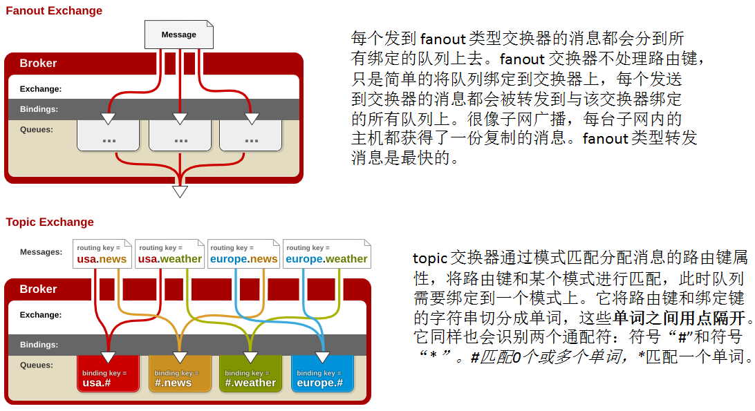 Fanout Exchange这个就非常简单了,如果说我们有一个交换器,是Fanout类型,他下面绑定了比如几个消息队列,当我们一个消息抵达fanout交换器以后,不管你这个消息的路由件是什么,它会把这个消息给里面的所有队列,每人都去发一份,这个就是我们说的广播模式,这个发送消息的速度,是最快的,这也是我们实现JMS里边,发布订阅模型的,一个参考实现,还有我们Topic Exchange,他就更复杂了,它允许我们对路由件,来做一些模糊匹配,然后有选择性的,把它发给某一个队列,比如我们Exchange是Topic Exchange,他下面绑定了四个队列,而第一个队列他绑定时,用的是usa.#,这个#是一个通配符,通配符允许#和*,#可以匹配0个或多个单词,*能匹配一个单词,他们是单词级别的匹配,我们回过来说,如果Exchange下边绑定了四个消息队列,第一个绑定线叫usa.#,相当于后边可以是任意一个单词,第二个叫#.news,前面可以是任意一个单词,#weather,前面是任意一个单词,后面是weather,europe.#,这个是后边是任意单词,前面是europe,那如果我们来发送消息,第一个消息我们写的键,叫usa.news,那符合哪个呢,首先usa.#是符合的,只要是usa开头的,不管后边是哪个单词,都行,那么这个消息会被放到这个队列,还会放到哪个队列呢,还会放到#.news,因为它是usa.news,它是一个新闻,我们这一块绑定的key是news,前面这个单词我们无所谓,都可以来进行模糊匹配,他就可以来发给这个内容,所以这个消息可以发到这两个队列上去,那剩下的也都一样,比如所有是weather的,不管是usa的还是europe的,都会来带weather的消息队列里面,所有以europe开头的,不管你是news还是weather的消息,都会根据规则来到这个队列里面,所有以news结尾的,不管你是usa的news还是europe的news,都会来到这个队列里边,这就是我们说的有选择性的,进行某种模式进匹配以后,我们再来决定发给哪个消息队列,那么总结起来来说,第一个根据路由件将消息发给指定的队列,我们说的单播模式,第二种,我们不管路由件发给我们绑定的交换器的所有消息队列,就是我们说的广播模式,第三种是根据路由件的匹配,我们有选择性的进行广播