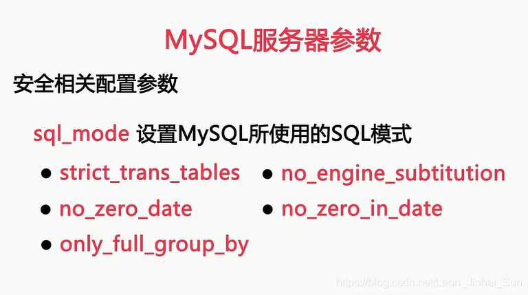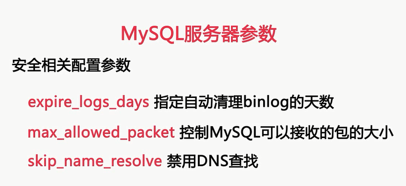 MYSQL有一些配置是和安全相关的,这些配置可以保证服务器更加的安全和可靠,可以避免一些无意义的数据插入到数据库中,比如错误的日期数据,下面我们就来看一下这些配置有哪些作用,首先看到第一个参数呢,这个控制的是bin_log自动删除的时间,间隔是以天为单位的,如果我们在启用了bin_log日志,就应该打开这个选项,这个就可以让服务器在指定的天数之后呢,自动清理旧的二进制日志,以防止二进制日志占用太多的空间,最终把服务器空间耗尽的情况,这个参数的设置呢,应该至少覆盖两次全备所间隔的天数,如果每天都进行全备的话,那至少把binlog保存7天左右,以便一些特殊情况下呢,比如当数据库的数据出现异常的情况下呢,就可能使用到binlog来查询这些异常数据是如何产生的,下面这个参数,是定义MYSQL定义最大包的大小,同时呢也会影响到一个用户,定义binlog最大的容量,对于这个参数呢,默认值来说呢,可以说是太小了,我们需要把这个值调整的稍微大一些,比如32M,这样的大小,另外要注意的是,如果使用的是主从复制,那么主从复制服务器关于这个参数的配置呢,最好是保持一致的,如果从上的配置呢小于主上的配置呢,那么就可能造成主从配置的失败,下面这个参数是禁用DNS的查找,当连接服务器时,默认情况下,MYSQL会试图确定连接的数据库的客户端所使用主机的域名,但是为了验证域名,MYSQL需要执行DNS的正向和反向查找,要是在DNS服务器出现问题的情况下呢,就会出现查询的丢精,最终会导致连接的超时,为了避免这种情况的发生呢,强烈建议呢,大家启用这个选项,也就是在验证时呢,关闭DNS查找,但是呢也要注意,我们启用这个参数的话,我们在使用用户授权时呢,就只能对特定的IP,或者是IP段,在本地HOST出现的域名,来进行授权了
