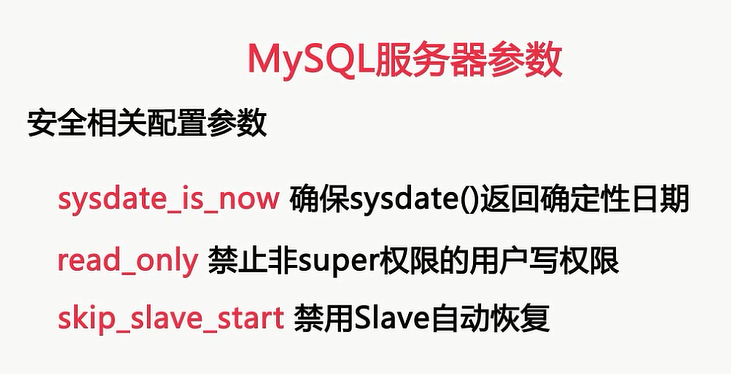 sysdate_is_now这个参数呢,确保在调用sysdate()函数时呢,所返回的结果和调用now()返回的结果是一样的,默认情况下面呢,在一个SQL语句中,多次调用,sysdate()函数可能会返回不一样的结果,这可能会造成意想不到的后果,比如在基于段的主从复制中呢,会造成主从复制的不一致,从而使主从复制中断,所以建议大家在配置文件中增加这个参数,接下来这个参数是readonly,这个选项建议大家在主从复制的从库中启用,他可以禁止任何没有super权限的用户,在从库中执行数据变更的操作,只接受从主库中传输过来的数据变更,这个参数对于保证主从数据的一致性呢,很有用,所以建议大家一定要在备库中启用这个参数,另外要说的就是,在给应用授权时呢,一定要注意,不要授予super权限,否则这个参数将起不到任何的作用,还有一个参数就是skip_slave_start,这个参数也是使用在主从复制结构中的,从库上的,他阻止MYSQL在重启以后,试图自动的启动复制,另外在一个不安全的崩溃或者其他的问题后啊,自动启动复制呢,是不安全的,所以建议大家用启动