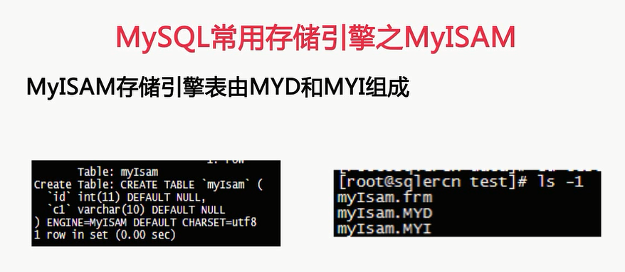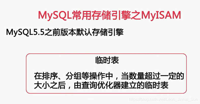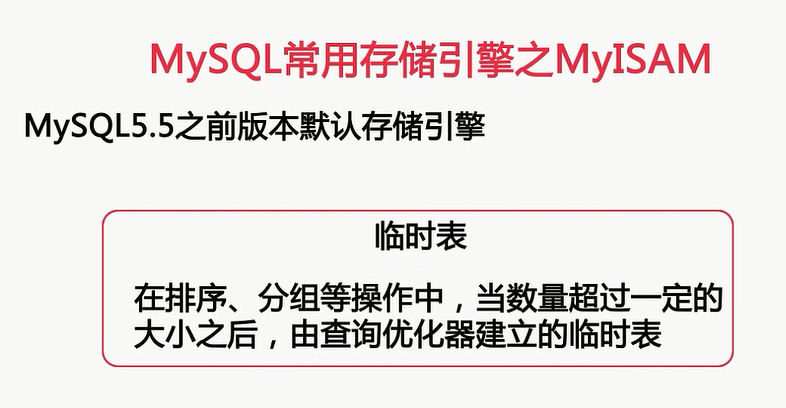 我们先来看看MYISAM这种存储引擎,MYISAM存储引擎呢,是MYSQL5.5以及之前的版本,在MYSQL数据库默认的存储引擎,由于这个原因呢,现在还有大量的服务器使用MYISAM的表,另外MyISAM也是MYSQL大部分系统表和临时表,所使用的一种存储引擎,注意我这里所说的临时表,并不是我们create template所建的临时表,对于create template语句所见的表呢,我们是可以使用各种存在MYSQL中的存储引擎的,而这里所说的临时表呢,是指在排序和分组等操作中,当数量操作一定的大小之后,由查询优化器建立的磁盘临时表
