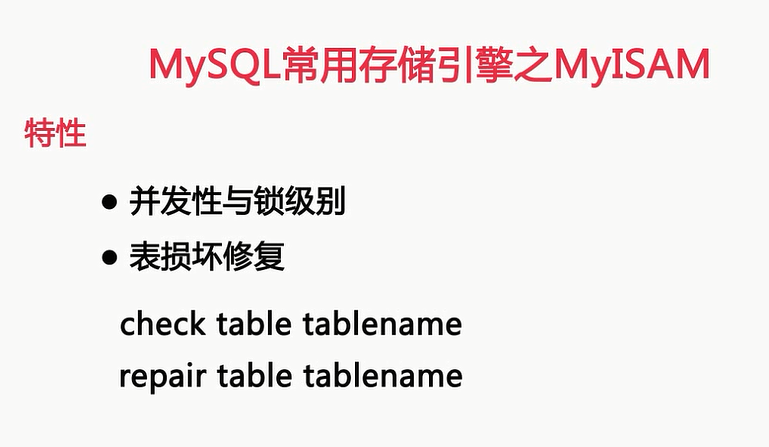 MYSQL最早使用的存储引擎之一,在极漫长的使用过程中呢,已经实现了很多自身的特性,以满足客户的需要,那我们就来看一下MYISAM有哪些特性,所以我们知道了这些特性,我们才能明白,在什么情况下,我们应该使用MYISAM存储引擎,首先MYISAM存储引擎的第一个特性就是,要从并发性和锁级别来看,MYISAM使用的是表级锁,而不是行级所,这个就意味着,只需要在整个表进行加锁,而在表中的数据进行读取时呢,也需要对所有的表加共享锁,从这里我们就可以看到,使用MYISAM存储引擎的表,读取和写入这两种是互斥的,当然在一些情况下呢,当我们对表中的数据进行读取时,也可以在表的末尾,插入数据,因此从上面介绍呢,可以看出,MYISAM对于读写混合操作的并发性不会太好,如果只是只读操作的话,就并发性而言,性能还是可以接受的,因为共享锁呢,并不会阻塞共享锁,他的第二个特性呢,从他的损坏修复来看,MYISAM支持由于任意以外关闭MYISAM表呢,检查和修复操作,像这里所说的修复呢,像这里所说的修复呢,并不是事务恢复,MYISAM并不是事务型的存储引擎,所以也不可能进行事务恢复的相关日志,所以要注意,对MYISAM进行修复,会造成数据的丢失,来对表进行检查,对于发现问题的表呢,可以使用repair table命令呢,对其进行恢复,下面我们就来看看这两个命令是如何使用的