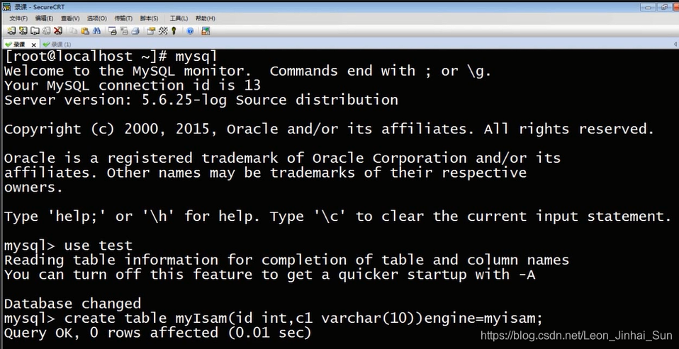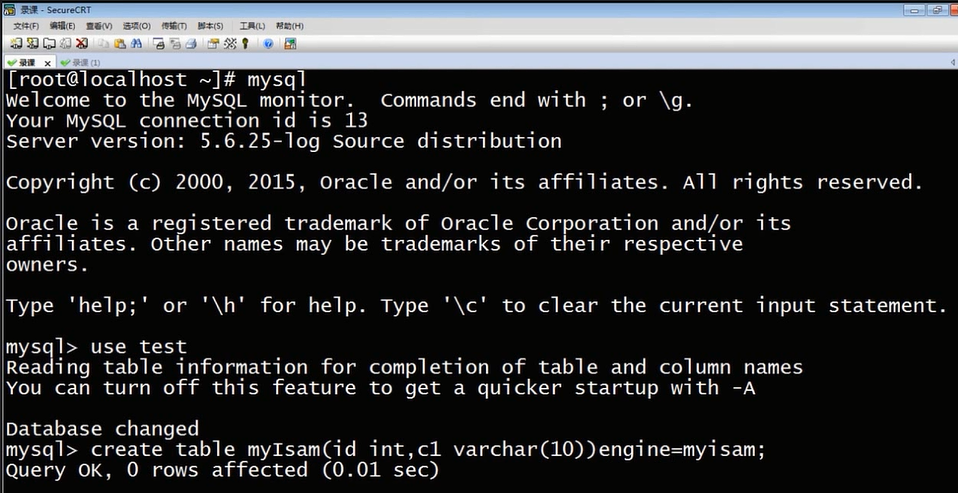 之前说过演示系统是基于MYSQL的一个实例,我们来到test库下,首先我们来建立一个myisam表,他有简单的两个列,一个是id列,一个是c1列,这里要注意的话呢,如果想建立存储引擎的表,就要使用engine这个参数来指定存储引擎,这里我们要建立的是myisam表,现在myisam表就已经建立好了,现在我们就来看看文件系统中,myisam表是如何存储的