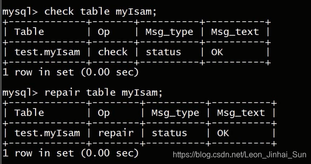 大家可以看到,就如我们刚才开始说的,MYISAM表呢,在系统文件存储中呢,myisam文件来存储的,frm这个文件,他存储的是这个表的结构信息,另外就是MYD文件,存储的是myisam表的数据信息,以及myi文件,存储的就是索引信息,但我们现在回到第一个连接,check table这个命令,对于这个表会有什么样的效果,大家可以看到,当我们使用check table对这个表进行检查的时候呢,他的message显示的是ok状态,说明这张表是没有任何问题的,如果我们使用repair table呢,同样由于我们这张表没有损坏,repair table也会返回ok的命令,如果有损坏的myisam表的话,就可以使用repair table命令呢,进行修复,另外呢,要注意,repair table对表进行修复的话