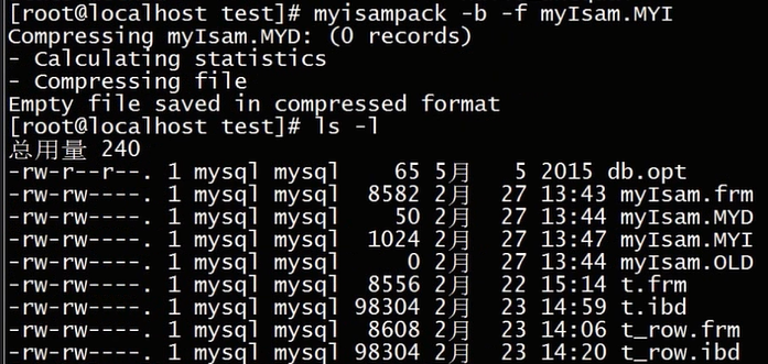 因为我们这张表太小,所以在默认情况下,是不能对这张表进行压缩的,所以我们使用-f参数来强制对其进行压缩,所以呢我们会看到,实际压缩之后的文件,比我们压缩前的文件还要大,myisam.old这个文件,是之前文件的一个备份,我们压缩后的文件不但没有变小,反而呢变大了,这是因为我们原来的文件太小了,他只有一行记录,所以完全没有必要进行压缩,这里只是演示了压缩命令是如何使用的,下面我们就来看一下对已经压缩的表,如果我们要进行读写操作,会有什么样的情况发生