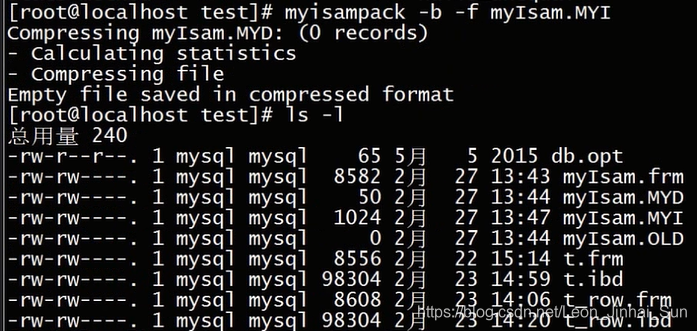 来演示一下如何对整张表进行压缩,我们刚才哪张表实际上并不大,一张刚创建的新表,所以如果我们想要使用myisampack命令进行压缩的话,我们需要指定一个-f参数,强制来对他进行压缩,然后我们要指定对这个表的MYI命令,我们接下来看一下效果,返回了说这实际上是一个很小的文件,他只有一条记录,空文件形成了一个压缩格式