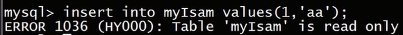 我们回到另一个连接,现在咱们的myisam表一已经被压缩了,这个时候我们对myisam进行插入操作,看到这里会返回一个提示,myisam是一个只读的表,所以对已压缩的表呢,不能进行写操作的,只能进行读操作