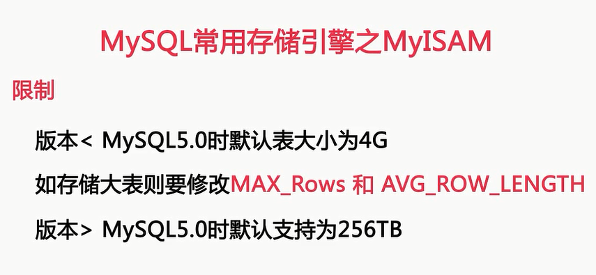 这里大致的介绍了一下MYISAM存储引擎特性,如果大家对特性还是感兴趣的话,可以看一下myisam的相关手册,来决定是否要使用myisam存储引擎了,下面我们来看一下myisam存储引擎的一些限制,来看看使用myisam表时呢,有什么样的限制,在使用myisam表时,有一点需要注意,就是在mysql5.0之前的版本,myisam表单表最大的文件呢,4个G,如果我们想在单个表存储超过4个G的,需要在建表的时候,通过指定max_rows和平均行长度,这两个参数来实现,这两个参数相乘的大小就是表能达到的最大的大小,对于大表来说,修改这两个参数会导致重建,所以呢,会需要一些时间,如果大家还在使用MYSQL5.0之前的服务的话呢,还是建议大家升级到最新版本的MYSQL的服务器,而对于单表最大4G的限制,MYSQL5.0版本之后呢,就没有了,在MYSQL5.0版本之后呢,单表就变成了256个TB,这就足够我们使用了,这里呢我们就已经完全了解了,myisam存储引擎的限制和特性,那么根据我们这些内容呢,我们就可以很容易的知道,myisam适合在什么样的场景下使用了
