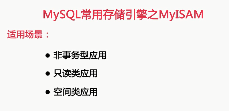 所以我们就看看myisam的适用场景,首先第一个适用场景呢,是非事务型应用,myisam首先呢,是一种非事务型的存储引擎,就是说,myisam是不支持事务的,前面给大家介绍了什么叫做事务,以及事务的一些ACID特性,并且也说过,关系型数据库,与其他应用最大的区别呢,是关系型数据库是支持事务的,那这里也说明不支持事务的存储引擎,那这里是不是有一些矛盾呢,虽然Myisam不支持事务,但是mysql其他支持事务的存储引擎呢,InnoDB,所以mysql还是一种支持事务的数据库,而对于Myisam不支持事务的存储引擎呢,也有其适应的场景,首先来说,首先是不是都需要事务呢,我想对于ORACLE应用,比如数据仓库,报表,还有大多数不涉及财务的应用,不需要事务管理性的,那在这样的应用场景中呢,就可以使用myisam这种存储引擎的,由于myisam可以对表进行压缩,所以对于只读的报表的应用呢,是非常合适的,所以myisam另外一个应用场景呢,只读类的应用,前面提到了myisam支持对数据文件的压缩,而且虽然在读取数据时,就加共享锁,共享锁是不会进行阻塞的,对于只读的应用来说,myisam的io和并发性能还是不错的,所以也只有在只读这种应用中呢,可以使用Myisam存储引擎的,myisam这种表的第三种使用场景呢,空间类的一些以应用,在MYSQL5.7之前,MYISAM是唯一支持空间函数的存储引擎,所以我们想在MYSQL中存储空间类的数据,如GPS数据,并且利用空间函数,对所存储的数据进行运算的话,咱们就只能用myisam存储引擎了,除了以上三种类型的应用之外,其他的是不太建议大家使用myisam存储了,大多数情况下使用InnoDB存储引擎,更适合我们的应用场景,下面我们就使用InnoDB存储引擎的特点