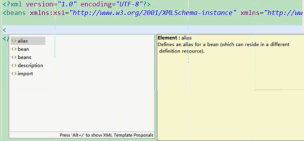 第一步你要书写我们的根元素,beans,这个东西没道理的,背下来的,根元素叫beans,一个字母都不能错,大小写也不要错,写上跟元素以后,接下来切换到设计视图
