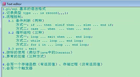 PL/SQL这一块,整个这一块需要大家掌握什么,就是他基本的格式,PL/SQL,基本的语法格式,如何声明一个变量,然后程序从哪里执行,执行的格式是什么,出现异常怎么处理,基本的语法格式,就这样写吧,第二个就是定义一个变量,变量赋个值,给他打印一下,这是最基本的了,然后定义多个变量,然后分别把多个变量都打印,然后你变量很多的话,把这个变量放到一个叫记录类型里,记录类型,就好像JAVA里面的类一样,我把这几个变量放在一个类中,我们讲JAVA的时候讲了一个类,里面有成员变量,然后创建这个类的对象,对象去调用这几个成员变量,可以赋值,可以打印,这里面有点类似,我声明一个记录类型,这个类型这样写的,type谁谁谁,is,然后就可以写is record,这个就是记录类型,这个类型可以看成类似于一个函数的概念,可以给他分成多个变量,然后就分号结束,这就是一个记录类型,逗号之间,变量声明,JAVA里面的成员变量,记录类型你可以看成是一个类,然后有记录类型的一个变量,相当于他的对象,用对象去调里面的变量,你可以赋值,这叫记录类型,记录类型完了以后,这个相当于我们给他输出了一个,输出了一条语句,你只能输出一条,一个对象对应一个这个,你要输出多个的话,又涉及到循环结构了,在PL/SQL里边,流程控制,流程控制就分成两个,叫条件判断,基本上每个语言,都有基本的流程控制,条件判断和循环,这样两块,那么条件判断这一块,它使用的有两种,一种叫if,then,然后,elseif then,else,就这结束了,else是最后一种情况,记得最后加上endif,表明你这个if是结束的,因为它里边没有像JAVA里面讲的大括号,我们大括号可以明确的指出来,他这里没有,没有的话就用关键字去结束了,最后叫end if,这是一个,方式一,还有一种方式,case,这个我们接触过,SQL里面接触过,when这种情况,再when再then,最后就直接加上这种情况,有一个end,end结束,这是条件判断的两种方式,我们给大家讲到时候,还有一个循环结构,这个呢有三种,方式三,三种,一个叫loop,循环,省略号就相当于写循环体了,循环什么东西,然后你得指明结束的条件,exit when,当循环这个条件的时候,就结束,然后end loop,表示结束,我们讲循环的时候,JAVA里面说了,有定义了四部分,条件,循环体,循环的迭代部分,还有循环的条件,循环的条件就是你终止的条件,那显然你的循环体是放在这儿的,然后exit when,相当于循环条件,就是什么时候终止,然后你要有迭代的话,这里面也行,放到这一块也行,最后还是结束,第二种方式叫while,当你怎么着的时候,我就开始执行这个循环体,执行完了以后,就end loop,这是第二种方式,最后一种,for呗,for他定义一个变量,写上一个i,定义一个变量,让这个变量从哪哪开始,并且到哪哪结束,这跟我们JAVA里面很像,JAVA里面也是定义一个局部变量i,然后让i从1开始,i小于等于100,他也是这种类似的格式,指明它是loop循环,最后给他end一下,三种格式讲完了以后呢,基本的流程控制就说完了,然后这里还涉及到两个关键字,比如他讲的goto,他就是像我们JAVA里面讲的break,后面可以加一个参,表示跳出他指定那一层的循环,然后这goto也是这个效果,它相当于我们刚才说的break,就叫goto,还有一个叫exit,表示退出,是两个关键字,然后流程控制,流程控制完了以后,我们声明一个记录类型,我把100号员工的,工资,hire_date,employee_id,给他输出出来,你可以把他整个看成是一个标签,一个对象,你要想输出多个record对象的话,比如80号部门的,所有员工的他的信息,那就得走一个循环,再输出一条,再输出循环,要用到流程控制的部分,还需要用到一个概念,叫游标,游标的使用,这是讲这个,多条语句的话,他呢可以这样理解,类似于JAVA中的,Iterator,迭代器,迭代器的作用是什么,作用于集合,用于集合的遍历,是吧,集合遍历的时候使用的是游标,他两的作用是类似的,游标,一个箭头,输出这一条以后,再往下,再往下,整个效果不是遍历吗,就是这个意思,游标的使用,其实我们想,上面的四点都是为了后面做铺垫,还有一个,第五个,异常的处理,每一个语言,稍微成熟一点的话,一定会考虑到异常如何来处理,比如人生病一样,语言多强大,这个人多壮,你再壮也可能生病,一旦出现异常的时候,你就告诉我生病了怎么办,那你就要考虑到异常的处理,PL/SQL同样如此,他异常的处理和JAVA有点不一样,JAVA里的try catch,throws两种方式,他这里有三种方式,这就不具体写了,到时再说,讲这前五个,都是为了第六个和第七个做铺垫的,讲前面这些,希望我们学PL/SQL,目标就是为了大家掌握第六点和第七点,会写一个,存储函数,还有叫存储过程,就是前面这些东西,就跟你做select语句一样,select完了以后,保存不下来,你留不住,就是你这次用了就完了,下次还得重写,那么写一个存储函数,或者存储过程,这个是可以保存到硬盘中的,这次你写完了,下次你想调,就直接来调,你想左边这,第三项就叫函数