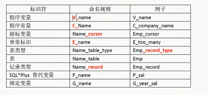 包括前面说的如何来定义一个变量,我们习惯用v下划线表示变量,起个名,常量C开头,异常E开头,然后游标,游标的英文就是cursor,表明这个是一个游标,记录类型,加一个record,表明是记录类型