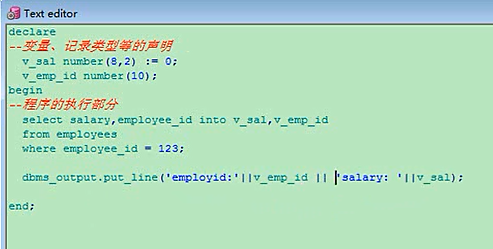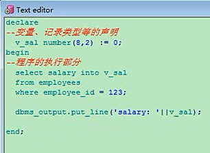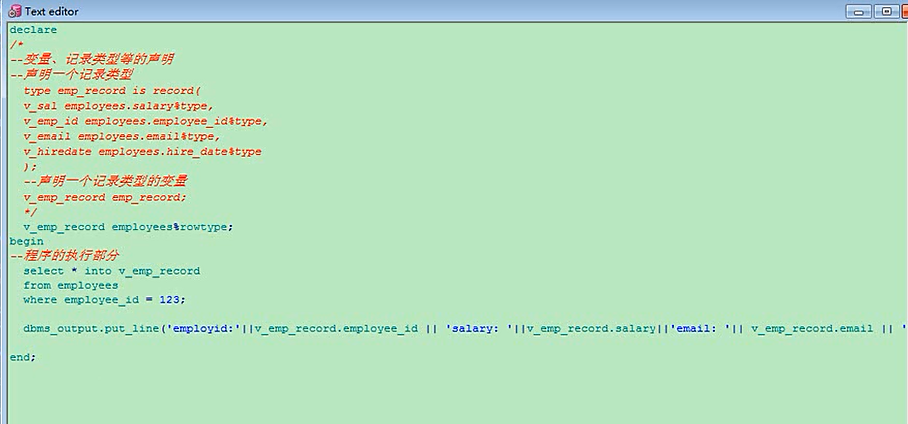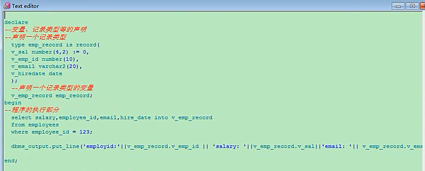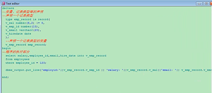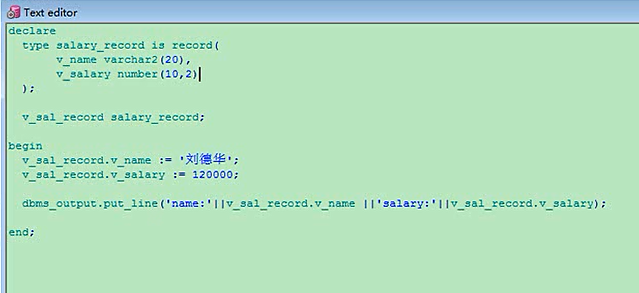 当然理解上不一样了,你原来的要好一点了,他这里是一个整体来出现的,record这个对象,你要写一个简单的也行,比如最简单的就是declare,我声明一个type,salary_record is record,有一个括号,分号结束,要是变量不多的话,多的话你就写成多行,定义两个变量,定义v_name,v_name是varchar2,v_salary是number类型的,定义了一个记录类型,然后给一个记录类型的变量,它是他这个类型的,结束,这个就是declare就写完了,再写上begin,这是程序执行的部分,他的这个变量,v_name,赋值冒号等于,刘德华,v_salary记录类型的,冒号等于这个值,然后打印,打印的话,你直接打印他不行,看不着,打印他,然后结束有分号declaretype salary_record is record(v_name varchar2(20),v_salary number(10,2) );v_sal_record salary_record;beginv_sal_record.v_name := '刘德华';v_sal_record.v_salary := 120000;dbms_output.put_line('name:'||v_sal_record.v_name||'salary:'||v_sal_record.v_salary);end;
