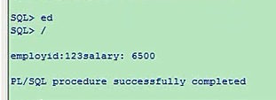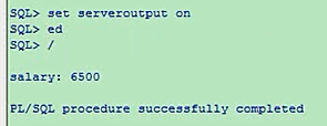 6500光出工资,是谁我不知道,想看看是谁,加一个employee_id,id的话,你不能在这写employee_id了,因为它识别不了,还得放在一个变量里,number类型的,这里你给他指定值也行,不指定也没事,不指定的话你在这给他写上,select salary,employee_id,into他,逗号v_emp_id,放在这两个变量里,记住要对应,salary定义在这里的是第一个的,这是第二个,类型得相互匹配的,然后你再打印就可以了,就这样declarev_sal number(8,2) := 0;v_emp_id number(10);beginselect salary,employee_id into v_sal,v_emp_idfrom employeeswhere employee_id = 123;dbms_output.put_line('employeeid:'||v_emp_id||'salary:'||v_sal);end;