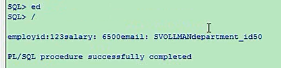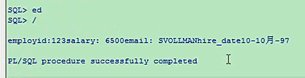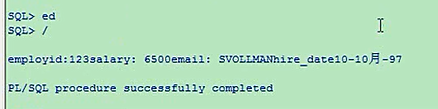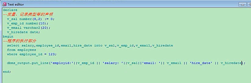 employeeid 123,工资6500,加一个hire_date,加一个email,那你就在这加呗,v_email,email类型是varchar类型的,20,没有赋值,v_hire_date,date类型的,分号,每一个声明都分号结束,然后依次的把这几个给你放进去,email,hire_date,这四个依次放入你刚才声明的变量里,然后打印就可以了,然后我们把这四个变量打印declarev_sal number(8,2) := 0;v_emp_id number(10);v_email varchar2(20);v_hiredate date;beginselect salary,employee_id,email,hire_date into v_sal,v,emp_id,v_email,v_hire_datefrom employeeswhere employee_id = 123;dbms_output.put_line('employeeid: '||v_emp_id||'salary: '||v_sal||'email: '||v_email||'hire_date'||v_hiredate);end;