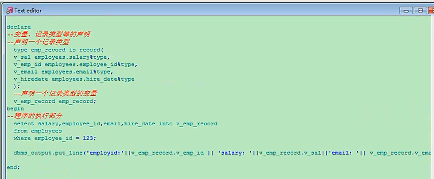 为了防止我出错,我们有一个百分号type的一个词,他表示什么意思,我这儿就不写他了,我们这里可以不要了,反正下面已经重新指定了,我让他和employees表里的,salary工资的声明的类型和精度是一样的,用百分号type,表明这个类型是一样的,同样的这里这样来修改,date你改也行,不改也行,他这个大小是不变的,就这样,声明了几个类型,动态的来获取,相对应employees表里的,叫字段也好,或者叫列也好declare type emp_record is record(v_sal employees.salary%type,v_emp_id employees.employee_id%type,v_email employees.email%type,v_hiredate employees.hire_date%type);v_emp_record emp_record;beginselect salary,employee_id,email,hire_date into v_emp_recordfrom employeeswhere employee_id = 123;dbms_output.put_line('salary:'||v_emp_record.v_sal||'employeeid:'||v_emp_record.v_emp_id||'email:'||v_emp_record.v_email||'hire_date:'||v_emp_record.v_hiredate);