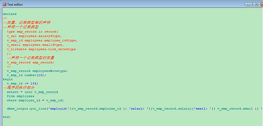 我们还是可以再升级一下,这个需要大家会,我们这里面也有,然后你现在只是获取了employees表里的个别几个列,我现在想获取所有的列,所有的列也都放在一个记录类型里面,那我们就依次在这里给他多写几列,把每一个列都写出来,然后select的时候每一个列都分别赋给record这个变量里,然后打印的时候,把他里面的这么多都打了,这是一种方式,再一种方式呢,说一个他这里面的注释,就是杠杠,单行注释,多行注释和JAVA里面一样,我把刚才的声明都给注了,v_emp_record,这个叫记录类型,employees%rowtype,这个employees表里的对象,然后每一列什么类型的,我完全跟你一样,我们在这里处理的时候,将employees表里的信息全放到record里面,然后呢我再打印一个信息,你想打谁就打谁,你这个就不能这样写了,因为你上面没有声明,相当于也可以给他声明,跟你这里面的名一样,所以这里是employee_id,举几个例子,我就从这里面输出几项,salary,email,hire_date,当然还有其他的,比如department_id,我输出一下你这个变量里面的,几个你想输的字段declarev_emp_record employees%rowtype;beginselect * into v_emp_recordfrom employeeswhere employee_id = 123;dbms_output.put_line('employeeid:'||v_emp_record.salary||'salary:'||v_emp_record.salary||'email:'||v_emp_record.email||'hire_date:'||v_emp_record||'department_id:'||v_emp_record.hire_date);end;