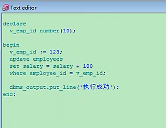 这又换人了,就是这个人,讲记录类型,我们刚才讲的都是select,当然除了select以外,还有增删改,写一个,decalre,改吧,改一个,把某个人的工资给他加上100,某个人的工资给他加上100,把谁的工资给他加上100,就定义一个变量,id number类型的,10,执行,执行update这样一个概念,update employees,set,set salary,salary加上100,where employee_id等于v_emp_id,v_emp_id赋个值,dbms_output.put_line,打印salary打印不了,改了要放到一个变量里面才行,我这里就不打了,输出一个说执行成功,enddeclarev_emp_id number(10);beginv_emp_id := 133;update employeesset salary = salary + 100where employee_id = v_emp_id;dbms_output.put_line('执行成功');end;
