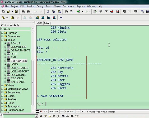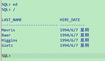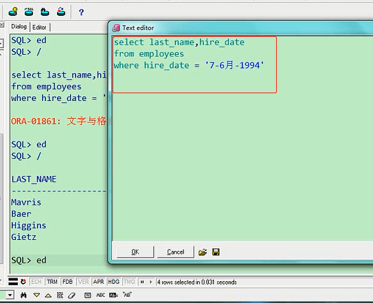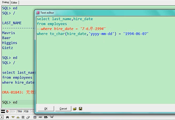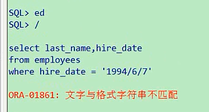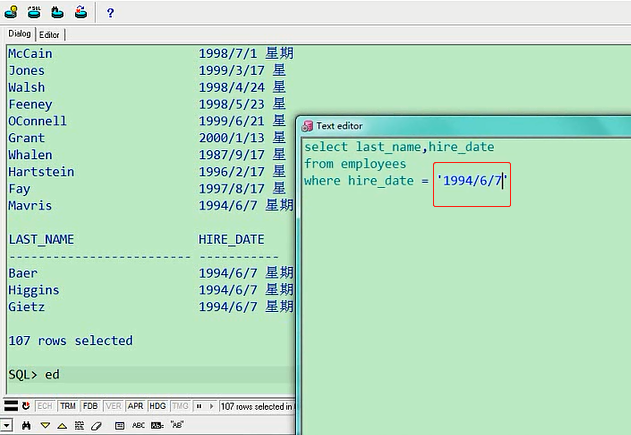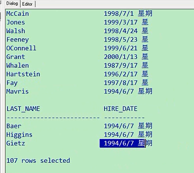 select last_name,hire_date from employees where hire_date = '7-6月-1994';我们看一下