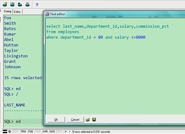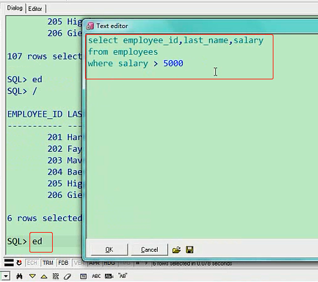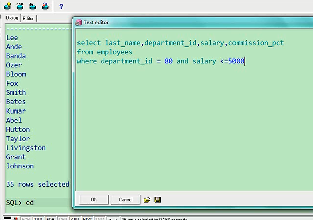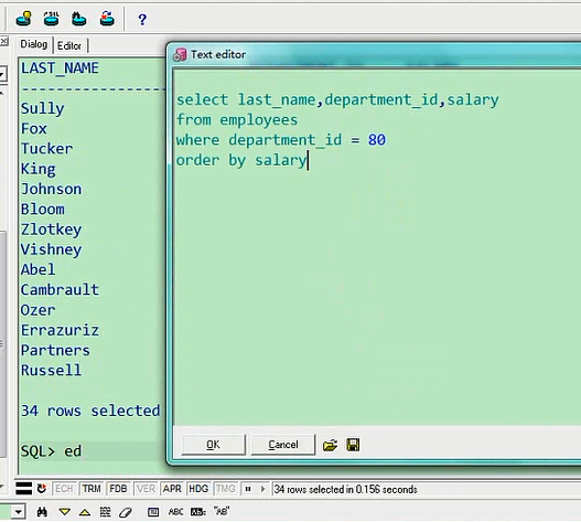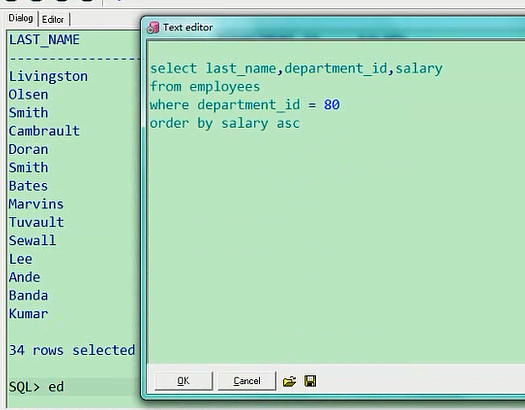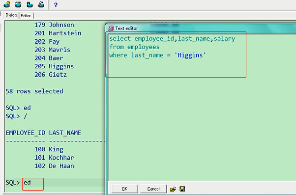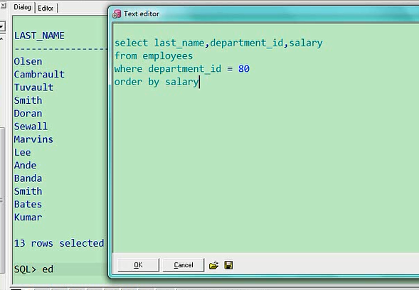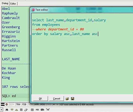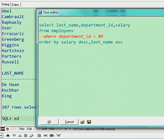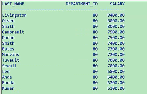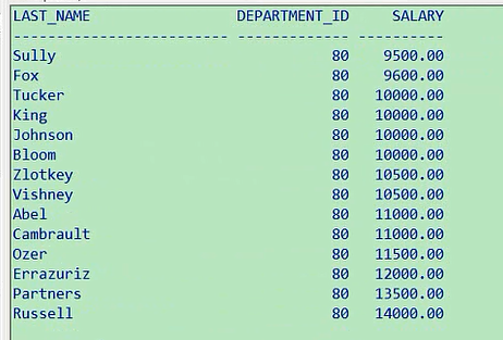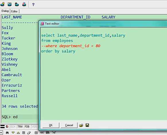 最高是8400,最低是6100,这个就是排序的意思,你也可以让他从低往高排,叫ascselect last_name,department_id,salary from employees where department_id=80 order by salary asc