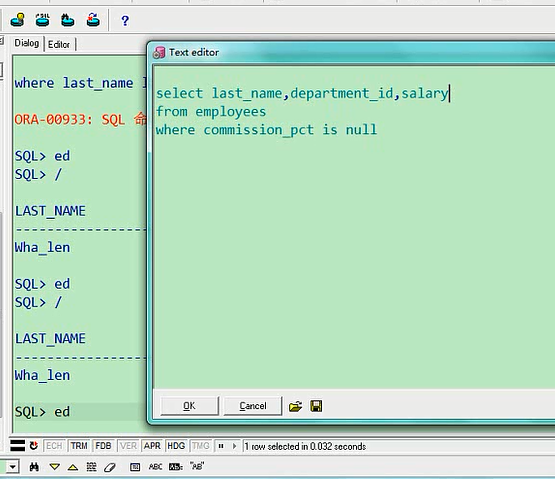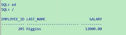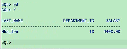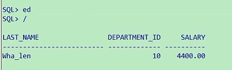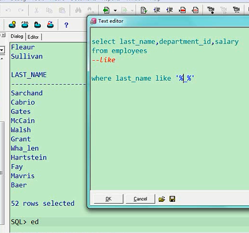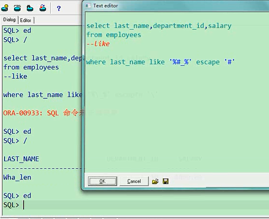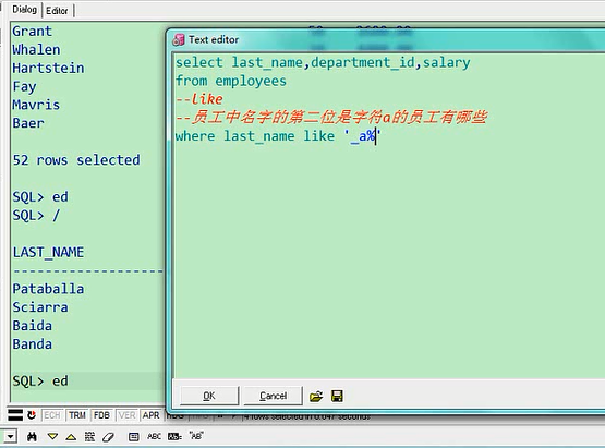 大家注意,两个下划线,这是两个,不要画蛇添足,中间加一个空格,这成啥了,这就成了第二个字符是空格,且第四个字符是a的呢,select last_name,department_id,salary from employees where last_name like '_ _a';所以说前两个你得让他连起来,表示第三个字符是a