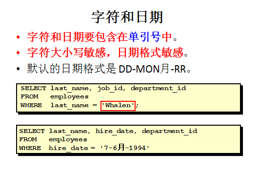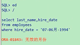 这种格式书写才行,实际上这个,你不需要给他记忆,我们后面会讲的单行函数,在单行行数里面,设计到hire_date和字符之间的一个转换,比如说,我就想查询94年6月7号来的,来的人都有哪些,这样理解一旦有一个操作失误的话,可能这个结果就出不来了,比如你这里一不小心加了一个0select last_name,hire_date from employees where hire_date = '07-06月-1994';